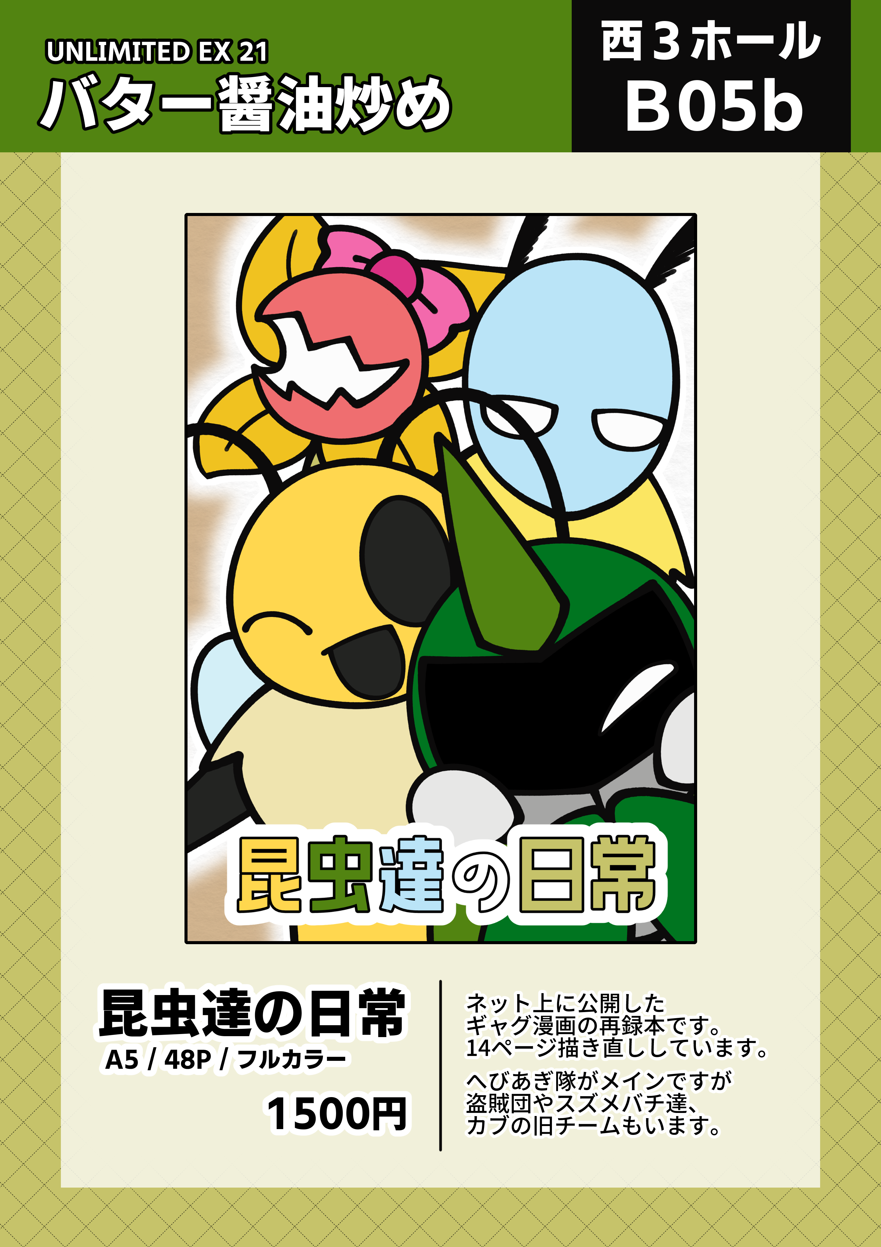 ≫TOKYO FES Jan.2026【UNLIMITED EX 21】 西3ホール B05b「バター醬油炒め」 ◆頒布予定◆『昆虫達の日常』A5 / 48P / フルカラー / 1500円 〈1/26〉BOOTH通販開始しました。https://mushroom1020.booth.pm/items/7913185